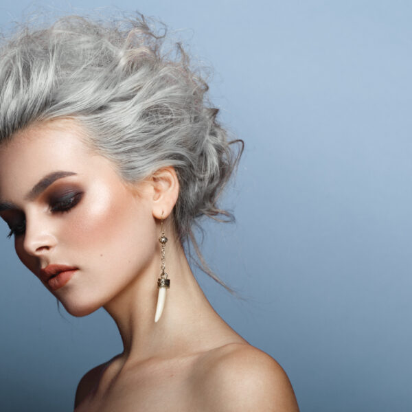 Profile portrait of fashionable, gorgeous young blonde woman, make up, naked shoulders, isolated on a blue background. ...